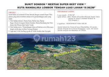 Tanah super best ocean view, luas di Lombok Tengah Jual Luas tanah 19.962m/ 1.99 Ha, hampir 200 are Ada 5 titik untuk surfing, di Teluk Dondon dan gerupuk Spek lahan, bukit yg eksotik Mertak, super view pantai dan alam lombok selatan dan gunung rinjani Cocok untuk berbagai jenis usaha hotel, villa resort, beach club atau untuk investasi dll SHM Harga 25jt/are nego, harga global hampir 5 milyar 10 menit ke central mandalika 60 menit ke central senggigi 45 menit ke bandara ben