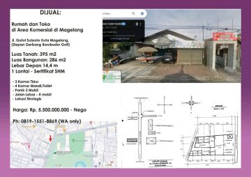 ✨ FOR SALE! Rumah + Ruang Usaha Super Strategis - Gatot Subroto, Magelang ✨ Peluang langka memiliki properti hunian + usaha di jalan utama kota! Lokasi di tengah kota - dekat Superindo, Akmil, RSUD, RS Gladiol & sekolah-sekolah Spesifikasi: - LT 395 m² | LB 286 m² - Lebar depan 14,4 m - 3 KT | 4 KM - Carport muat 4 mobil - Listrik 2200 VA - Air PDAM - Hadap Timur Cocok untuk kantor, klinik, usaha komersial, atau investasi jangka panjang. Lokasi super ramai & visibilitas tinggi! :rocket: Yang cari lokasi premium, wajib cek!