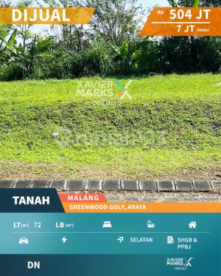 Dijual Tanah Kavling di Cluster Greenwood Golf, Kota Araya Malang - hanya 1 km ke Araya Club House (fasilitas kolam renang, gym, lapangan tenis, lapangan basket, dll) - ?hanya 5 menit ke driving range, golf course, lapangan padel - ?one gate system - ?ROW 10 meter - ?bonus view pemandangan alam Luas Tanah 72m2 Dimensi 6m x 12m Hadap Selatan Legalitas SHGB / PPJB ke-1 (bisa ditingkatkan ke SHM setelah dibangun rumah) Harga Jual Rp 504juta (Rp 7juta per m2) NOTE : jika perlu kavling lebih luas, ready 2 kavling jejer dengan total luas 145m2 (dimensi 12x1208xxxx
