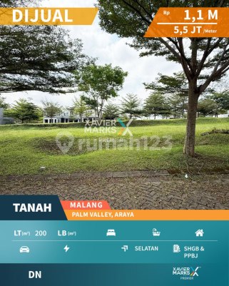 Dijual Tanah Kavling di Cluster Lotus Valley, The Araya Malang - fasilitas perumahan terlengkap (Persada Hospital, Plaza Araya, banyak sekolah, resto, cafe, club house, golf course, lapangan padel, dll) - hanya 3 menit ke kampus Binus - ?cocok untuk dibangun rumah tinggal atau rumah kost - ?lingkungan aman dan nyaman di dalam cluster dengan ROW 12 meter Luas Tanah 200m2 Dimensi 10m x 20m Hadap Selatan Legalitas SHGB / PPJB ke-1 (bisa ditingkatkan ke SHM setelah dibangun rumah) Harga Jual Rp 1,1M (Rp 5,5juta per m2) 082025