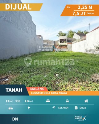 Tanah Kavling di Jalan Kembar Cluster Golf Kota Araya Malang Luas Tanah 300 m2 Dimensi 12m x 25m Hadap Selatan Legalitas SHGB / PPJB ke-1 (bisa ditingkatkan ke SHM setelah dibangun rumah) - private cluster - one gate system - security 24 jam - ROW jalan 20 meter Harga Jual Rp 2,25M (Rp 7,5juta per m2) nego 0720xxxx