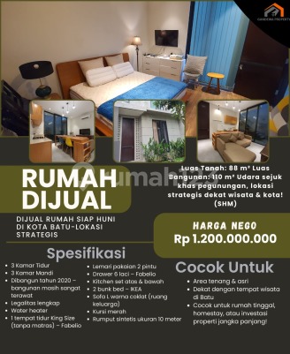 DIJUAL RUMAH SIAP HUNI DI KOTA BATU Perumahan Kings 8 No. 25A, Oro-Oro Ombo, Batu, Malang Udara sejuk khas pegunungan, lokasi strategis dekat wisata & kota! ✨ Spesifikasi Rumah: - Luas Tanah: 88 m² - Luas Bangunan: 110 m² - 3 Kamar Tidur - 3 Kamar Mandi - Dibangun tahun 2020 - bangunan masih sangat terawat - Legalitas lengkap ️ Harga sudah termasuk isi rumah! - Water heater - 1 tempat tidur King Size (tanpa matras) - Fabelio - Lemari pakaian 2 pintu - Fabelio - Drawer 6 laci - Fabelio - Kitchen set atas & bawah - 2 bunk bed - IKEA - Sofa L warna coklat (ruang keluarga) - Kursi merah (kamar bawah dekat pintu) - Rumput sintetis ukuran 10 meter Harga Buka: Rp 1,2 Miliar - Nego Sampai Deal! :fire: Keunggulan Lokasi: - Area tenang & asri - Dekat dengan tempat wisata di Batu - Cocok untuk rumah tinggal, homestay, atau investasi properti jangka panjang! Minat atau ingin survei langsung? 08561028xxx 082110128xxx