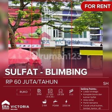Ruko DISEWAKAN Di Raya Sulfat, Komplek Bisnis Dan Kuliner Sulfat, Area Ramai, Parkir Bersama, Dekat Taman Sulfat Legalitas : SHM Luas tanah : 102 m2 Dimensi : 4 x 25 Luas bangunan : 128 m2 Dimensi : 4 x 16 Bangunan 2 lantai Kamar mandi : 2 PLN 2200 Air PDAM Harga yg ditawarkan : 60 juta/thn SH-Rasulf