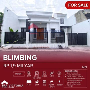 Rumah Jual Lokasi dalam Cluster Dekat Jalan Raya S.Parman (malang-surabaya), Hartono Elektronik, Kanwil DJP, Hotel Atria, Hotel Alana, Lokasi Dekat Suhat. Semi Furnished (Water Heater, AC) > 1 Menit ke Jl. Raya S.Parman, Hartono Elektronik > 2 Menit ke Kanwil DJP, Hotel Alana, Hotel Atria > 7 Menit ke kampus Brawijaya, Polinema, Kuliner dan Pusat bisnis Soekarno Hatta Spesifikasi : Sertifikat : SHM Luas Tanah : 170 m2 Dimensi : 12 x 14,2 Luas Bangunan : 160 m2 1,5 Tahun Kamar tidur : 4 kamar Mandi : 2 Carport Listrik : 2200W Air : PDAM + Pompa Hadap : Barat Laut Harga : 1.9 M NN-prmn