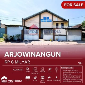 Gudang dan Kantor Poros Jalan Kondisi Sangat Terawat Akses Nol Jalan Raya Mobil dan Truck Bisa Masuk Area Bebas Banjir, Lingkungan Aman Dekat 4 Menit Pasar Gadang, Terminal Hamid Rusdi, 5 Menit dari Blok Office/ Kantor Terbaru, GOR Ken Arok, Indogrosir Malang, PG Kebonangung, Exit Tol Sawojajar Spesifikasi : Sertifikat : SHM Luas Tanah : 544 m2 Dimensi : 17,5 x 34 Luas Bangunan : 525 m2 2 Lantai Kamar Tidur : 4 Kamar Mandi : 2 Listrik : 10.600 W Air : PDAM Ruang dan Fasilitas: - 1 Ruang Tamu - 4 Toilet (jongkok) - 1 Toilet (duduk) - 1 Aula Serba Guna (kapasitas 50 orang) - 1 Kamar Tidur dengan Toilet Dalam - 2 Ruangan Kantor - 1 Ruang Gudang - 1 Pantry - 1 Ruang Satpam - 1 Ruangan Mushola - 3 Ruang Serba Guna - Parkir mobil/ Truck kapasitas 7 Unit - Taman Kecil Harga : 6 M SH-Raywon