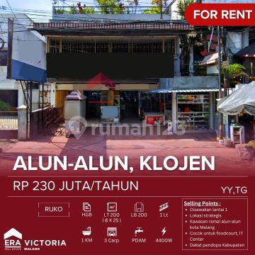 Ruko Sewa Lokasi Sangat Startegis Area Alun-alun Kota Malang Dekat Gajah Mada Mall, Kantor Kabupaten Malang, Dinas Kominfo & SDM, Selangkah ke Kuliner Legendaris (Rawon Nguling, Mie Gloria, Semur Brintik, Lumpia Hok Lay) Sangat Cocok untuk Segala Usaha Spesifikasi : Sertifikat : HGB Luas Tanah : 200 m2 Luas Bangunan :200 m2 1 Lantai Kamar Mandi : 1 Carport : 3 Listrik : 4400W Air : PDAM Harga : 230 Juta/Tahun YY,TG-Agslim
