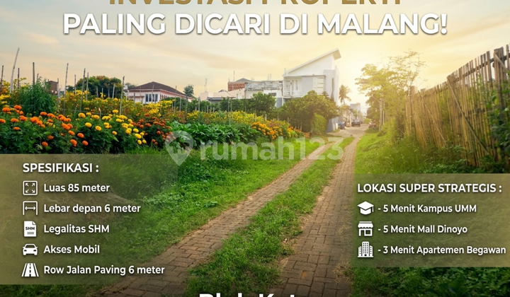 "Luas 85 meter Lebar depan 6 meter Legalitas SHM Akses mobil Row jalan Paving 6 meter - 5 Menit Kampus UMM - 5 Menit Mall Dinoyo - 3 Menit Apartemen Begawan