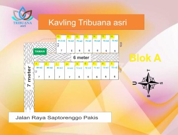 Promo Tanah Kavling Tribuana Poros Saptorenggo Pakis Malang wa 0812xxxxxxxx Tersedia : - Luas 6x12 : 72 m2 Harga 252 juta - Luas 6x12,5: 75 m2 Harga 262 juta - Luas 7x12 : 84 m2 Harga 294 juta Harga 3,5 jt/m2 - NEGOTABLE promo 200jt Fasilitas: - surat SHM - Akses jalan Paving 6-7 m - Gorong2 Lokasi Strategis : - 3 menit ke bandara ABD saleh - 3 menit ke Exit Toll Asrikaton Pakis - 5 menit ke Wisata Mendit - 5 menit ke Kampus BINUS Araya