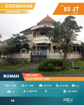 J37 Disewakan rumah furnish di Villa Puncak Tidar Malang LT 350 m2 LB 400 m2 Bangunan 2 lantai 4 + 1KT 3 + 1 KM Garasi dalam Carport muat 2 mobil Listrik 1300VA (token) Air perumahan Shm Rp 85jt/th Minim 2 th Furnish More Info : Lusia - 0813xxxxxxxx Tirta - 081136xxxx Xavier Marks Premier