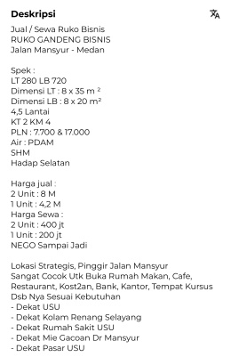 Jual / Sewa Ruko Bisnis RUKO GANDENG BISNIS Jalan Mansyur - Medan Spek : LT 280 LB 720 Dimensi LT : 8 x 35 m ² Dimensi LB : 8 x 20 m² 4,5 Lantai KT 2 KM 4 PLN : 7.700 & 17.000 Air : PDAM SHM Hadap Selatan Harga jual : 2 Unit : 8 M 1 Unit : 4,2 M Harga Sewa : 2 Unit : 400 jt 1 Unit : 200 jt NEGO Sampai Jadi Lokasi Strategis, Pinggir Jalan Mansyur Sangat Cocok Utk Buka Rumah Makan, Cafe, Restaurant, Kost2an, Bank, Kantor, Tempat Kursus Dsb Nya Sesuai Kebutuhan - Dekat USU - Dekat Kolam Renang Selayang - Dekat Rumah Sakit USU - Dekat Mie Gacoan Dr Mansyur - Dekat Pasar USU