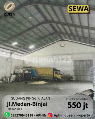 SEWA GUDANG Jl. Medan - Binjai ( PINGGIR JALAN ) Medan Deli __________________________________ Sewa : 550.000.xxx /nego/ thn __________________________________ Spesifikasi: ▪︎ Total luas tanah 4600 m ▪︎ Luas bangunan ±1500 m ▪︎ Dimensi tanah 43,5 x 105 m ▪︎ SHM ▪︎ bisa masuk kontainer ▪︎ hadap Selatan ▪︎ gudang siap pakai ▪︎ bisa masuk kontainer ▪︎ dekat Tol Tanjung Mulia ▪︎ posisi pinggir jalan utama Jl.Medan -Binjai Akses sekitar : ▪︎ 12 menit ke Gerbang Tol Semayang ▪︎ 13 menit ke Manhattan Mall More info: Aphin 0852xxxxxxxx