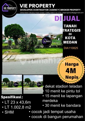 Tanah Luas di Medan. Dijual di wilayah yang nyaman. Dengan kategorinya adalah sebagai berikut: - dua kavling luas 23 x 43.6 m2 - Sertifikat: 2 SHM - Sertifikat Hak Milik - bisa beli salah satunya Dan properti ini juga terdepan karena: - Dekat Stadion Teladan - Dekat Pusat Perbelanjaan. - Dekat Fasilitas Kesehatan. - Dekat Tempat Wisata. - Lokasi di Pusat Kota. - Properti Bisa Nego. - Akses Jalan Muat 2 Mobil. - Lokasi Strategis. - Hitungan Tanah Kosong. Keberadaan tanah berikut mudah dijangkau, hanya selangkah menuju berbagai fasilitas utama dan menarik. Hanya Rp. 4 M, anda bisa langsung dapatkan tanah terbaik di daerah Medan Kota ini.
