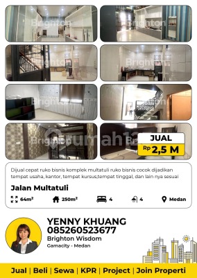 Dijual Cepat Ruko Bisnis Komplek Multatuli Ruko Bisnis Cocok dijadikan Tempat Usaha, Kantor, Tempat Kursus,Tempat Tinggal, dan lain nya Sesuai Kebutuhan Rp 2.5M NEGO SHM Hadap Utara Kecamatan Medan Maimun Kota Medan - Sumut Dimensi LT : 4 x 16 m² Dimensi LB : 4 x 16 m² 4 ½ Lantai Kamar Tidur 4 Kamar Mandi : 4 PLN : 5.500 watt Air : PDAM Rp 2.5M NEGO Hadap Utara SHM IMB Ada Lokasi Strategis & Terjangkau Ke Semua Tempat Dekat Ke Rumah Sakit, Ke Mall, Supermarket, Perguruan Tinggi, Sekolah International Bahkan Di Dalam Juga Ada Universitas, Tempat Kursus, Salon, Area Pijat, Hotel, Berbagai Butik Ternama, Bridal, Rumah Makan, Cafe, Coffee Shop, Toko Dessert Semua Serba Ada di Dalam Komplek