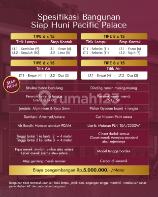 Tempat tinggal yang nyaman tidak hanya ditentukan oleh rumahnya, tetapi juga ditentukan oleh fasilitasnya Pacific Palace dirancang untuk menunjang gaya hidup yang lebih seimbang dengan berbagai fasilitas ekslusif . Tinggal dekat area hiburan memberi kenyamanan lebih dalam keseharian. Dari hangout santai, kuliner, quality time bersama keluarga-semua mudah dijangkau Hunian Pacific Palace dirancang untuk kamu yang mengutamakan kenyamanan jangka panjang - Tersedia villa ukuran 6,8 dan 10 meter - Fasilitas swimming pool, clubhouse & playground - Start 1,2 M-an | DP 0% Hubungi segera untuk informasi lebih detail Jadwalkan survei lokasi langsung ke whatsapp yaa 0811633xxxx / klik icon wa Silahkan Cek juga katalog iklan kita yg lainnya