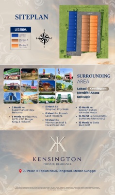 Kensington is a Luxury Residence ocated in a developing location with beautiful Architecture and Extraordinary Facilities, this Luxury House is trutya Dream Home to Live in. Jl. Pasar III Tapian Nauli Medan Sunggal Type Abbizer LT : 144 m² LB : 162 m² Type Derrien A LT : 144 m² LB : 162 m² Type Derrien B LT : 132 m² LB : 142 m² EV - Q,T