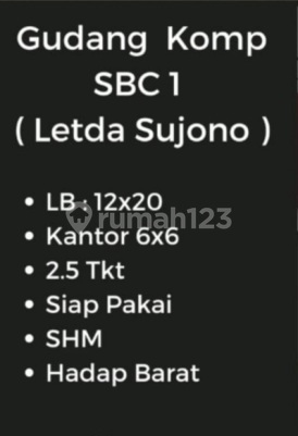 Dijual Gudang Komplek Pergudangan SBC 1 Blok D No. 1 Letda Sujono LB 12 x 20 m Kantor 6x6 2,5 Tingkat Siap Pakai SHM Hadap Barat Harga 3,5 M pajak masing masing FR