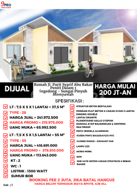 Akses Menuju : * Dekat Sekolah Segedong * Dekat Polsek Segedong * Dekat Pasar Segedong Spesifikasi : ● LT : 7,5 x 5 x 1 lantai = 37,5 m² ● Type : 28 ● Harga Jual = 241.972.xxx ● Harga Promo = 219.975.xxx ● Uang Muka = 65.992.500 ● LT : 7,5 x 5 x 1,5 lantai = 55 m² ● Type : 55 ● Harga Jual = 416.691.xxx ● Harga Promo = 378.810.xxx ● Uang Muka = 113.643.xxx ● WC : 1 ● KT : 2 ● listrik : 1300 watt ● sumur bor ● struktur beton bertulang ● Pondasi plat Beton & cakar ayam 2 lantai ● Dinding double lantai granite ● plandfound hallo gyspum rangka atap bajaringan & genteng multiroof ● pintu jendela aluminium closed duduk + exhaust fan ● akses mobil ● lampu led ● shm ● one gate sistem lokasi strategis & bebas banjir ● kusen pintu baja/kayu/u-pvc ● booking fee 2 juta, jika batal hangus harga belum termasuk biaya bphtb, ajb dll