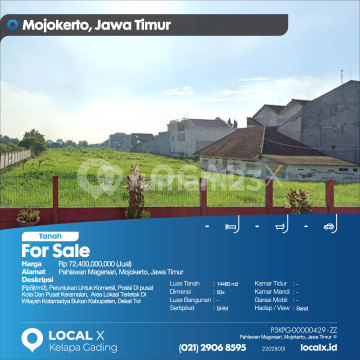 (Rp5jt/m2), Peruntukan Untuk Komersil, Posisi Di pusat Kota Dan Pusat Keramaian, Area Lokasi Terletak Di Wilayah Kotamadya Bukan Kabupaten, Dekat Tol For Sale - Jual Tanah Pahlawan Magersari, Mojokerto, Jawa Timur Harga. Rp 7240000xxxxJual) Deskripsi Properti. (Rp5jt/m2), Peruntukan Untuk Komersil, Posisi Di pusat Kota Dan Pusat Keramaian, Area Lokasi Terletak Di Wilayah Kotamadya Bukan Kabupaten, Dekat Tol Luas Tanah. 14480 m2 Dimensi. 50x Luas Bangunan. 14480 m2 Sertipikat. SHM Kamar Tidur. - Kamar Mandi. - Garasi Mobil. - Hadap / View. Barat LOCAL X Kelapa Gading ******** ⓪②① ②⑨⓪⑥ ⑧⑤⑨⑤ P3KPG-0000xxxx-ZZ-J