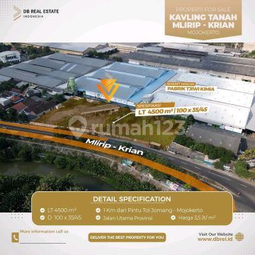 1 Kilometer aja dari Pintu tol JOMBANG-MOJOKERTO DIJUAL : TANAH di Raya MLIRIP-KRIAN (AREA PERGUDANGAN INDUSTRI) LT 4500 (100 x 35/45) Sederet dengan Perusahaan Besar seperti TJIWI KIMIA Posisi Jalan UTAMA PROVINSI Kontainer 40" OK Harga : 3,5 jt / m2 MURAHHH