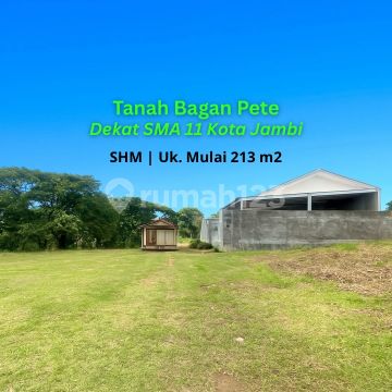 Dijual Tanah Bagan Pete Siap Bangun • 800 Meter dari Jalan Utama • 5 Menit dari Kampus Politeknik Jambi • 3 Menitdari SMA 11 Kota Jambi Spesifikasi Lahan • Lokasi Strategis • Sangat Cocok Untuk Bangun Rumah atau Investasi • Luas Tanah Mulai 213 m2 • Row Jalan 5 Meter