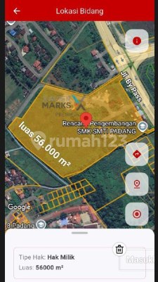 Dijual Tanah Kavling Siap Bangun di Jalan Raya Bypass, Kota Padang Sumatera Barat Cocok untuk dibangun kompleks perumahan elit, hotel, apartemen, mall, kompleks pergudangan, kawasan bisnis Lokasi strategis di pusat Kota Padang dan selangkah ke Exit Tol Zonasi aman Lahan sudah kering siap bangun Luas Tanah 56.000 meter Lebar Depan Tanah 170 meter Hadap Barat Legalitas SHM on Hand