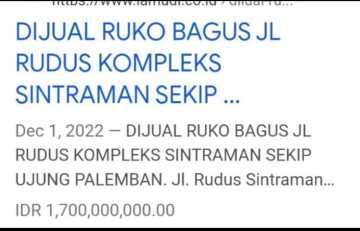 Dijual Ruko Bagus Jl. Rudus II Komplek Sintraman Sekip Ujung Palembang Luas tanah:125 ... m² Dimensi tanah: (5 x 25 mtr) Luas bangunan: .240.. m² Dimensi bangunan : (5x 20 mtr...lt.1) , lt. 2 dan kt. 3 =5x15 mtr) Kamar tidur:3 Kamar mandi: 3 Hadap mata angin:selatan Air: PDAM Listrik: 4400. watt Full furnished: tidak ada.. Dapur sederhana. Legalitas SHM: ada Harga 1,5 M Bisa nego IMB: ada PBB: ada 2025.