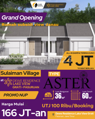 Cluster Sulini Hill dan Sulaiman Village dengan Type Aster 36/60 Perumahan Susidi dengan Viuw danau Ranu Garati yang Indah Spesifikasi - Bangunan 36m² - Luas tanah 60m² - 2 Kamar Tidur - 1 Kamar Mandi - 1 Carport Benefit - Cicilan Flat 1 Juta-an Sampai Lunas - All in biaya 4 juta (*S&K Berlaku ) - NUP ( Booking Fee 100K) - Bisa KPR. - Subsidi Angsuran. - Subsidi Pemerintah. - Angsuran Rendah . - Syariah. - DP 0%. - Bebas Banjir. - Siap Huni. - Lingkungan Islami. - Cicilan Bertahap. - Free Biaya Akad. - Free Biaya Notaris. - Free Biaya KPR. - Free BPHTB. - Dekat Sekolah Negeri. - Dekat Fasilitas Kesehatan. - Dekat Tempat Wisata. - Dekat Tempat Ibadah. - Dekat Taman Kota. - Dekat Akses Tol. Kawasan ini berlokasi di area strategis Grati, dekat dengan berbagai fasilitas penting. Dengan harga mualai 166 Juta-an, Anda bisa segera memiliki hunian impian ini.tanpa worry dan rasakan kemudahan dan manfaat luar biasa dari properti pilihan ini. (Marketing 2)