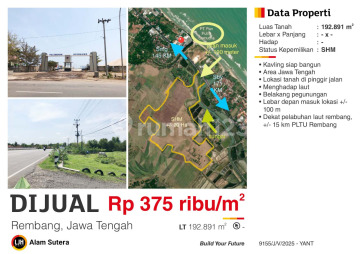 Kesempatan terbatas buat Anda dapatkan tanah strategis dengan return investasi tinggi di Rembang, Pasuruan. Tanah ini menawarkan kelengkapan fasilitas serta memiliki nilai tepat yang siap untuk segera Anda miliki, utamanya bagi Anda yang mencari hunian di lokasi yang dekat dengan fasilitas umum. Detail Properti ini adalah: - Sertifikat: SHM - Sertifikat Hak Milik Tidak hanya itu, namun properti ini juga memiliki keunggulan sebagai berikut: - Bebas Banjir. - Dekat Kawasan Industi. - Pemandangan Pantai. - Cocok Untuk Investasi. - Properti Bisa Nego. - Lokasi Strategis. Lokasi Strategis terletak di Rembang, properti ini memudahkan akses Anda ke fasilitas-fasilitas utama dan unggulan Harga yang sangat kompetitif yaitu, Rp. 375.000, tanah ini siap menjadi milik Anda! Nikmati segala kemudahan dan berbagai keunggulan menarik saat properti premium ini milik Anda. Hubungi segera dan dapatkan informasinya ataupun cek unit!
