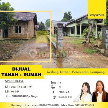 Rumah terletak di kecamatan Gedong Tataan,Pesawaran,Lampung Selatan.Lokasi sangat strategis hanya 200 meter dari Jalan Raya Ahmad Yani.Sangat dekat dengan Museum Nasional Transmigrasi Lampung.Cocok untuk usaha. Luas tanah 952m2,luas bangunan 96m2 kamar tidur 4,kamar mandi 2 listrik 900va,air sumur sanyo