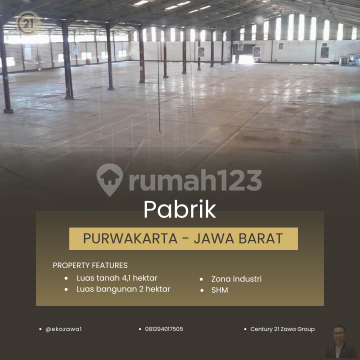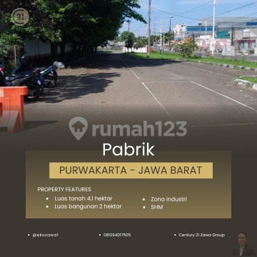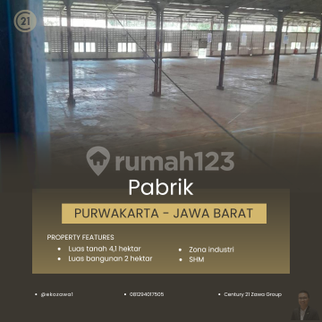 DIJUAL PABRIK DI PURWAKARTA Lokasi : Purwakarta - Jawa Barat Spec : - Luas Tanah: +/- 42.000 m² - Luas Bangunan 20.000 m² - Sertifikat Hak Milik - Listrik 6600KVA - Zona industri - Bangunan Ready Pakai / masih Bagus. - Akses Container 40 feet HARGA JUAL 86 MILIAR - Exc PPN Terima Titip dan Jual Beli Property Seluruh Indonesia KHUSUS PEMBELI SERIUS silakan hubungi: @ekozawa10812xxxxxxxx Century21 Zawa PIK #gudangforsale #pabrikforsale #gudangpabrikforsale #gudangdijual #pabrikdijual #tanahforsale #tanahdijual