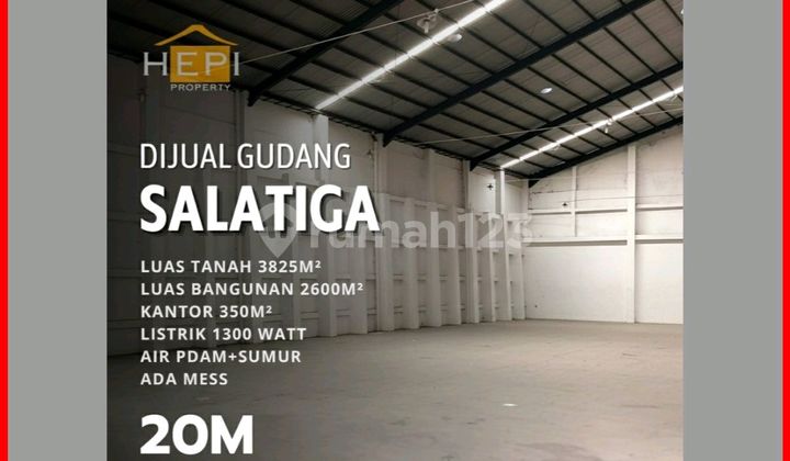 Dijual Gudang di Salatiga Luas Tanah 3825m² Luas Bangunan 2600m² Kantor 350m² Listrik 1300 watt Air PDAM dan Sumur Air PDAM + Sumur Ada Mess Harga 20 M Hub Swanny 0812250xxxxyea