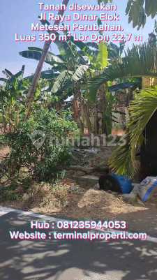 Disewakan , Tanah 350 m2 SHM di Perum Dinar Meteseh Kec Tembalang Semarang Timur Informasi properti: + Tanah berbentuk kotak + Luas Tanah : 350 m2 Lbr Depan : 23 m Hadap : Selatan + Sertifikat SHM Fasilitas : + Sudah ada aliran listrik + Sudah ada PDAM Lingkungan : + Pergudangan, Perkantoran, Perumahan Anugrah, Perum Borobudur, Perum Puri Dinar, Pasar Meteseh, Cafe/ rumah makan + Jalan 7 meter aspal Lokasi Terdekat : + Dekat RSUD Wongsonegoro Jl fatmawati Ketileng + Dekat Perkantoran, Pergudangan, Pasar Meteseh, Perumahan Dinas Mas, Perum Emerald, Perum Kharisma, Sekolahan Bias, + Dekat UNDIP, Polines, Poltekes Tembalang, UNIMUS , SMAN 15 Semarang, SMAN 29 dan Stikes + Dekat Rumah makan, Cafe Bento + Dekat Bank BRI, Bank BCA, Mandiri dan Bank BTN Lokasi dan : + Jl Raya Perum Dinar Indahb Kec Tembalang Dekat Pasar Meteseh Kota Semarang + Harga Rp 30 Juta / tahun + Hub Suyanto Terminalproperti