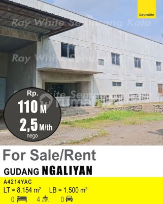 Gudang di Ngaliyan, Semarang. Dijual di wilayah yang tenang. Dengan rinciannya adalah sebagai berikut: - Kamar Mandi: 4 - Sertifikat: SHM - Sertifikat Hak Milik - Daya Listrik: 53000 W - Kondisi Perabotan: Unfurnished Dan properti ini juga pilihan tepat karena: - Siap Huni. Keberadaan gudang berikut strategis, hanya selangkah menuju berbagai fasilitas utama dan menarik. Hanya Rp. 110.000.xxx.000, anda dapat langsung dapatkan gudang terbaik di daerah Ngaliyan ini.