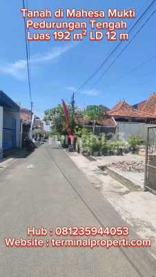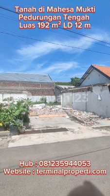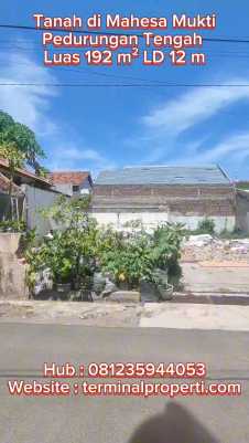 Dijual Tanah Murah SHM Langsung Pemilik di Mahesa Mukti Pedurungan Tengah Semarang Timur Spesifikasi + Luas Tanah : 192 m2 Lbr Dpn: 12 m Hadap : Utara + Air PDAM + Sertifikasi: SHM Kondisi: + Tanah Datar + Jalan 6 mtr aspal + Kawasan Kantor dan Pemukiman + Cocok untuk rumah dan investasi Lokasi Terdekat : + Jl Raya Majapahit, Jl Raya Sukarno Hatta + Dekat Polsek Pedurungan + Dekat Bank BCA, Bank BRI, Bank Mandiri, BTN + Dekat Hotel Horison, ADA Swalayan, MC Donald, Hokka Bento, Lokasi: + Mahesa Mukti Blk Polsek Pedurungan Tengah Semarang Timur + Harga Rp 715 Juta + Hub Suyanto Terminalproperti