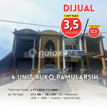 Dijual Ruko di Jl Pamularsih, Semarang Barat Luas Tanah: @180m2 Luas Bangunan: @230m2 Lantai: 2 Gudang: 1 Kamar Mandi: 4 Dapur: 3 Air: Sumur Garasi: Tertutup Harga Jual: @3,5M (4 ruko: 12,5M)
