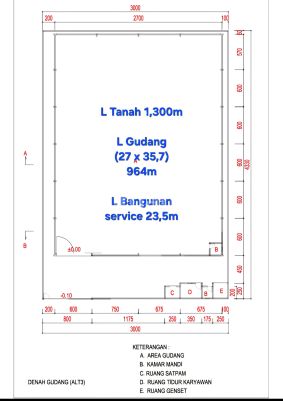 Sewa Gudang bangunan baru Di Kawasan Industri Candi Gatsu Semarang Luas Tanah 1300 m² Luas Bangunan Gudang 964 m²(27*35,7) Luas Bangunan Service 23,5 m² Tinggi Tembok Gudang 7m Lantai Cor K300 Kamar mandi : 2 Ruang Genset Kamar Tidur Satpam Ruang Satpam Sumur Bor PLN Pulsa 7,700 Watt Harga Sewa 650 Juta / Tahun Minimal Sewa 2 Tahun