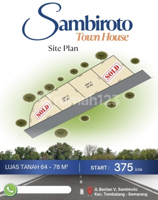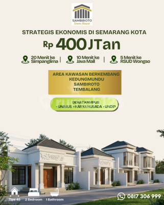 SAMBIROTO TOWN HOUSE JL Berlian V Sambiroto, Tembalang - Kota Semarang Harga Promo Ramadhan Tinggal 2unit Terakhir 2 lantai : ● Kav 1 - SOLD ● Kav 2 Tipe 80/78 Hanya 775 Juta cash Tanpa Garasi - 720 juta 1 lantai : ● Kav 3 Tipe 45/70 Hanya 475 Juta Cash (Best Deal) ● Kav 4 - SOLD Keunggulan lokasi : - Hanya 500 meter an dari Jl Sambiroto Raya, 300m dari Jl Elang Raya - Dekat Kampus Univ. Karya Husada - Dekat McD & Swalayan Aneka Jaya - Dekat Spbu, KFC & Swalayan GAIA - Dekat RS Primaya, Kampus & RS UNIMUS - Akses Mobil Lancar, Datar & Bebas Banjir - Sertifikat SHM Elektronik Pecah Perbidang