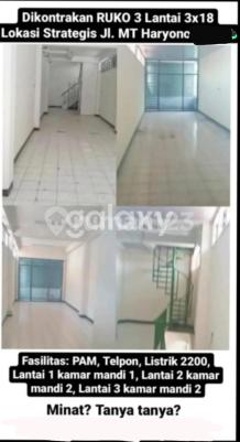 Disewakan Ruko di Jl MT Haryono Semarang Timur Luas Tanah : 54 m2 Luas Bangunan : 3x18 m2 (54 m2 ) Kamar Mandi : 3 Listrik : 2200 Air : PAM