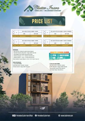 CLUSTER INARA TEMBALANG 2-MULAWARMAN UNDIP: - Rumah ready tipe 50/81m :Rp.865jt (32C) - Kosan ready tipe 48/67m² (3kt-3km-1 dapur): Rp.846jt (22B) - kosan ready tipe 30/69m² : Rp.790jt (1E) - rumah 1 lantai tipe 30/89m² = *Rp.762jt* (19C) - rumah 2 lantai tipe 72/89m² =harga normal Rp.1.080M (19C) Paket kosan 1 lantai : - 6kt-6km-1 dapur tipe 72/105m² = Rp.1.370.000M (unit unggulan area depan no.2A) Paket kosan 2 lantai : - 12kt-12km-1 dapur tipe 144/105m² Rp.1.9M an (unit no.26C) - 21 Kt- 21 Km- 3 dapur tipe 360m² :Rp.3.2M (promo) - 18 kt- 18km- 3 dapur tipe 360m² : Rp.2.9M (2A) Note: unit rumah bonus 1 paket pilihan ; -ac 2 unit ½pk -kichenset -tandon air+cor dak -potongan 10jt potongan harga puluhan juta rupiah