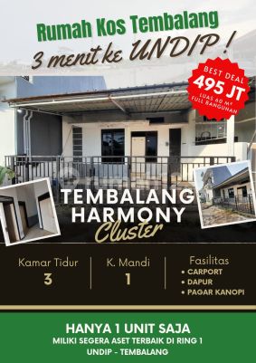 Rumah Tembalang Di Cluster Tembalang Harmony Luas tanah 60m full bangunan (ready unit)3KT, 1KM, carpot mobil, ruang tamu, dapur, SHM Dijual murah 495jt - lokasi strategis dekat UNDIP - Komplek perumahan cluster - Rumah ready, terawat - Dekat exit tol Tembalang/Banyumanik - Kawasan padat dan ramai penduduk - Cocok buat rumah pribadi, untuk kost atau investasi dikontrakkan mahasiswa Undip
