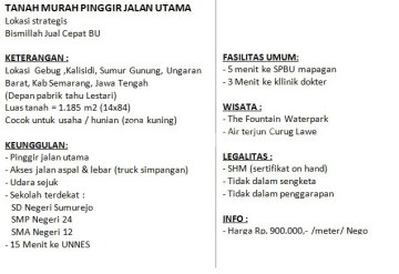 DIJUAL TANAH KALISIDI UNGARAN BARAT Luas Tanah 1185 m2 (14 x 84) SHM Harga 900 ribu/meter (nego)