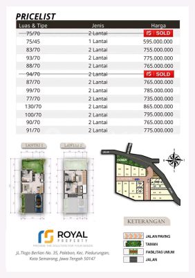 Deskripsi : Cluster Royal Valley Ungaran (one gate sistem) Terletak Di Ungaran Kota 1 Arah jalan ke exit tol sangat strategis Total unit ada 13 SHM sudah split✅ Type Bangunan 50-70 Tersedia 1-2 Lantai Luas Tanah 75 - 130 Range Price 500jt an up Suasana asri adem ✅ View gunung ungaran✅ Bebas banjir✅ Akses perbelanjaan banyak✅ Dekat Rumah Sakit✅ Dekat Kampus Undaris ✅ Dekat Jalan Tol✅ Dekat Rumah Dinas Bupati✅ Dekat Kawasan Asmara✅ Jantung Kota✅ listroyalagc