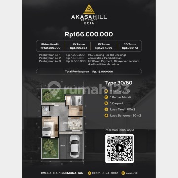 Akasahill Residence Boja – Hunian Kekinian & Terjangkau • Dp Ringan: cukup Rp 15 juta saja, cicilan mulai 1jutaan per bulan • Ukuran: o Tanah 60 m² & bangunan 30 m² (Type 30/60) o 2 kamar tidur • 1 kamar mandi • carport • listrik 1.300 VA