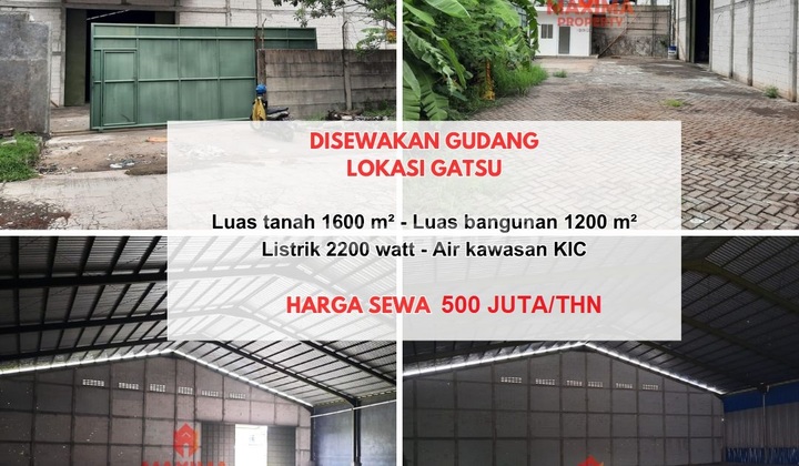 Disewakan Gudang Gatsu Luas tanah 1600 m² Luas bangunan 1200 m² Lebar 40 mtr Listrik 2200 watt Air kawasan KIC Harga sewa 500 jt/thn Pajak ditanggung masing²
