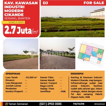 TSI/14316 For Sale Kavling Kawasan Industri Modern Cikande, Serang, 65.880 m², HGB Harga Rp 2.700.000 /m² Alamat Serang, Banten Deskripsi Properti Kavling di Kawasan Industri Modern Cikande, siap bangun, Infrastrukturya sudah siap untuk Industri, fasilitas sudah ada saluran gas, lokasi strategis, dekat dengan akses Tol dan samping Pabrik Nippon Seiki, HGB Luas Tanah 65,880 m² Dimensi - Luas Bangunan - Jumlah Lantai - Perabotan - Kondisi - Kamar Tidur - Kamar Mandi - Garasi mobil - Jalur Telepon - Daya Listrik - Hadap / View - Sertifikat HGB LJH Realty Taman Semanan