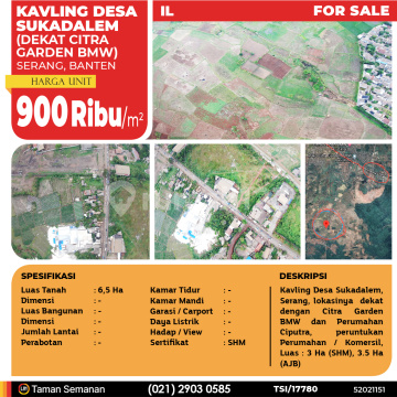 TSI/17780 For Sale Kavling Desa Sukadalem (Dekat Citra Garden BMW), Serang, 6.5 Ha, SHM Harga Rp 900 Ribu /m² Alamat Serang, Banten Deskripsi Properti Kavling Desa Sukadalem, Serang, lokasinya dekat dengan Citra Garden BMW dan Perumahan Ciputra, peruntukan Perumahan / Komersil, Luas : 3 Ha (SHM), 3.5 Ha (AJB) Luas Tanah 6,5 Ha Dimensi - Luas Bangunan - Dimensi - Jumlah Lantai - Perabotan - Kamar Tidur - Kamar Mandi - Garasi / Carport - Jalur Telepon - Daya Listrik - Hadap / View - Sertifikat SHM LJH Realty Taman Semanan Property Help ✆ 0212903xxxx