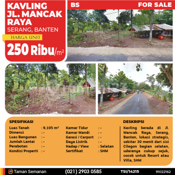 TSI/14215 For Sale Kavling Jl. Mancak Raya, Serang, 9.105 m², SHM Harga Rp 250 Ribu /m² Alamat Serang, Banten Deskripsi Properti Kavling berada di Jl. Mancak Raya, Serang, Banten, lokasi strategis, sekitar 30 menit dari sisi Cilegon bagian selatan, udaranya cukup sejuk, cocok untuk Resort atau Villa, SHM Luas Tanah 9.105 m² Dimensi - Luas Bangunan - Jumlah Lantai - Perabotan - Kondisi - Kamar Tidur - Kamar Mandi - Garasi mobil - Jalur Telepon - Daya Listrik - Hadap / View Selatan Sertifikat SHM LJH Realty Taman Semanan Property Help ✆ 0212903xxxx