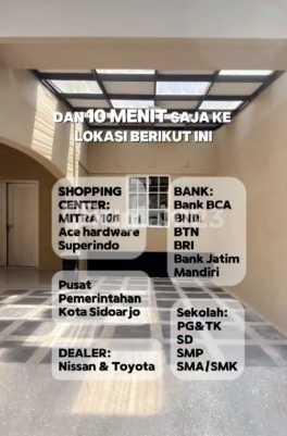 - Rumah mewah, baru gress 2 lantai - LT: 120m² LB: 220m², dimensi 8 x 15, KT 4 KM 2, gudang, ruang terbuka di bagian belakang. - PLN 2200 watt, ada bathup - Lokasi dekat area: Shopping center: Mitra 10, Superindo, Ace Hardware Bank : BCA, BNI, BRI, BTN, Mandiri, Bank Jatim Sekolah : Play Group dan TK, SD, SMP, SMA, SMK - Dealer mobil Nissan dan Toyota, alun-alun, fasum lainnya di area Sidokepung RJ-65