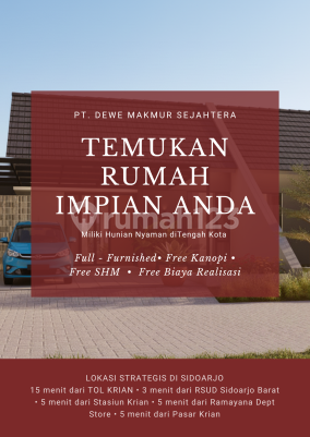 Rumah 1 lantai di Krian, Sidoarjo. Dijual rumah di wilayah yang nyaman. Properti 1 lantai ini berada di lingkungan strategis. Kategorinya adalah sebagai berikut: - Kamar Tidur: 3 - Kamar Mandi: 2 - Sertifikat: HGB - Hak Guna Bangunan - Hadap: Selatan - Kondisi Perabotan: Furnished Tidak hanya itu, properti ini layak untuk dimiliki karena: - Full Furnished. - Angsuran Rendah . - Bonus Canopy. - Siap Huni. - Bebas Banjir. - Dekat Akses Bus Kota. - Dekat Pusat Perbelanjaan. - Dekat Fasilitas Kesehatan. - Dekat Tempat Ibadah. Properti ini sudah lengkap dengan fasilitas: - Masjid. - Taman. - Keamanan 24 jam. - Taman. Lokasi rumah berikut strategis, hanya selangkah menuju berbagai fasilitas utama dan menarik. Dengan Rp. 399 jutaan, anda bisa langsung dapatkan rumah strategis di daerah Krian ini.