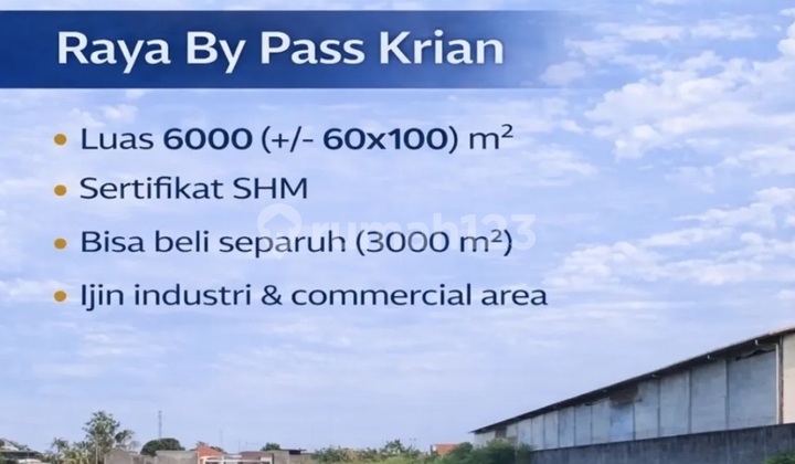 Kavling industri raya bypass Krian Posisi 0 jalan raya super strategis. Jalan besar. Container 40 feet bisa lewat Surat Hak Milik Zona Industri Sudah ada izin pengeringan Butuh urug 1,5 meter Detail: Luas Tanah 6.060m2 Dimesi 60x100 Harga 3,3juta per meter Bisa dibeli setengah luas 3.000m2